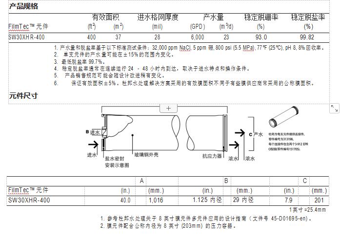 在 FilmTec™ 產(chǎn)品系列里,SW30XHR-400 元件是脫鹽率最高的海水反滲透膜元件, 多數(shù)情況下,采用一級海水反滲透系統(tǒng)就可達到嚴格的水質(zhì)要求。