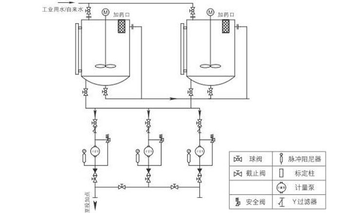 磷酸鹽加藥裝置主要由溶液箱、計量泵、安全閥、液位計、針型閥、球閥、攪拌器、Y型過濾器、底盤等部件組成。投用時將固體磷酸鹽加入溶液箱內,然后按比例注入除鹽水或凝結水開動攪拌器攪拌幫助溶解,成品磷酸鹽溶液由計量泵注入鍋爐汽包內。加藥的運行工況均根據(jù)爐水的硬度來確定加藥方式。操作方式分為手動控別方式,也可依據(jù)上位系統(tǒng)輸出的控制信號,進行自動控制,實現(xiàn)自動加藥。