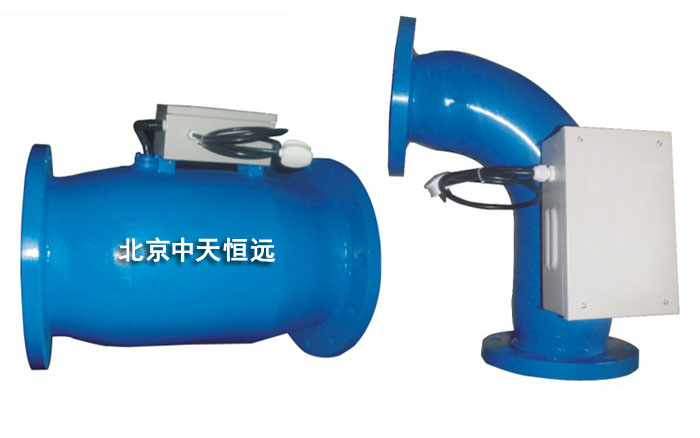 電子式水處理器是利用電子元器件產生的高頻交變電磁場,讓水在經過水處理器時,物理性能發生改變——原來締合鏈狀大分子斷裂成單個水分子,水分子的偶極矩增大,帶有極性的單個水分子包圍在水中溶解鹽的正負離子周圍,使鹽離子運動速度降低,靜電引力下降,碰撞結合的機會大大減少,無法形成水垢,達到防垢的目的。極性水分子的偶極矩增大,與鹽正負離子的吸引力增大,從而使受熱面或管壁原有的水垢變得松軟,龜裂,在水中力的作用下,以致自行脫落,從而達到除垢的目的,同時水中微電流破壞微生物的生存環境,另外在水中形成的活性氧自由基能氧化微生物的細胞膜,破壞微生物的歧化酶,從而殺滅水中的微生物,達到殺菌滅藻的目的。